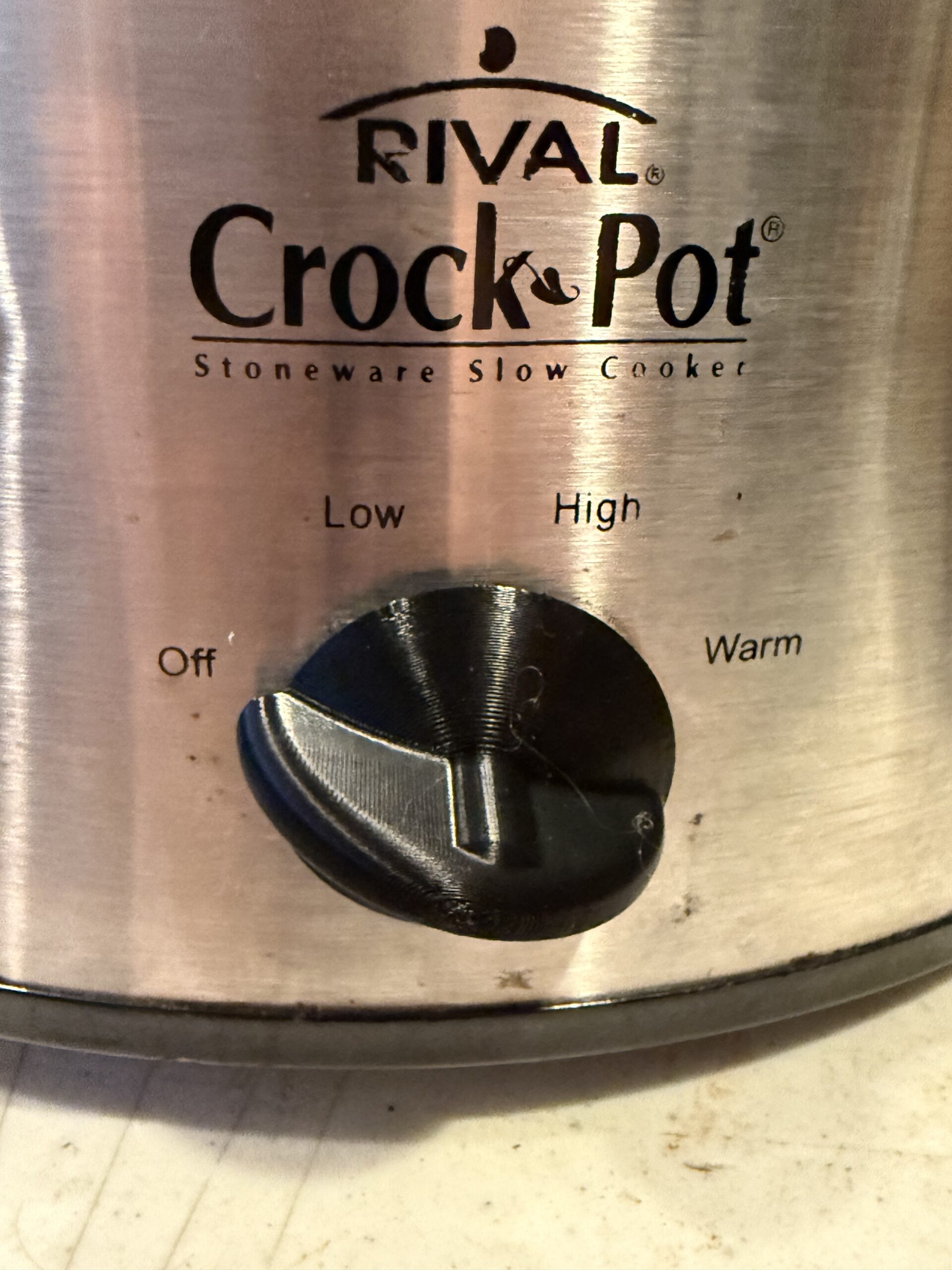 Printomic™ brand replacement knob, built to withstand everyday use, this control knob provides a solid, dependable upgrade for your 3.5 Quart CrockPot. It restores smooth, accurate control adjustment without the cracking or slipping issues common in worn factory knobs. This is an in-house design that has been customized and tested for this model CrockPot. I have made the shaft thicker and stronger, the handle on the knob is wider and taller. The shaft has a taper to it so that when you slide it onto the shaft it grips the shaft similar to the OEM knob. The handle points to the markings on the unit it was tested on.